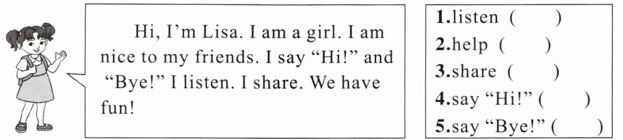 解析:根据 Lisa 自我介绍的内容:“嗨,我是丽萨。我是一个女孩。我对我的朋友们很友好。我说‘你好!’和‘再见!’。我倾听。我分享。我们玩得很开心!”可知:只有“2. help my friends”没有出现,故答案为其余四个全打“√”。