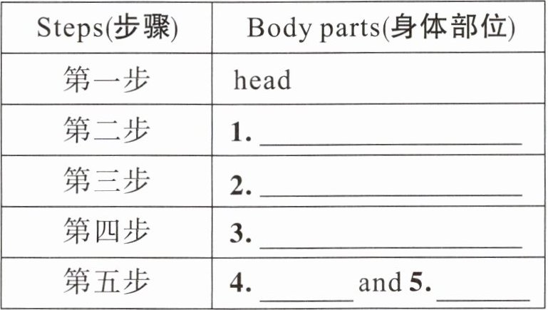 1. ears 解析:由对话“And draw two ears.”可知,第二步是画耳朵。2. eyes 解析:由对话“Next,draw two eyes.”可知,接下来画眼睛。3. mouth 解析:由对话“Then,draw a mouth.”可知,第四步画嘴。4. arms 解析:由对话“Last,draw arms and hands.”可知,第五步先画的是胳膊。5. hands 解析:由对话“Last,draw arms and hands.”可知,第五步后画的是手。