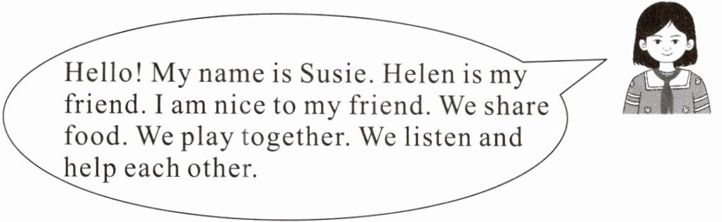 Hello! My name is Susie. Helen is my friend. I am nice to my friend. We share food. We play together. We listen and help each other.