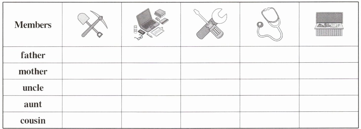 四、听录音,在下列人物对应的工具下面打“√”。读两遍。