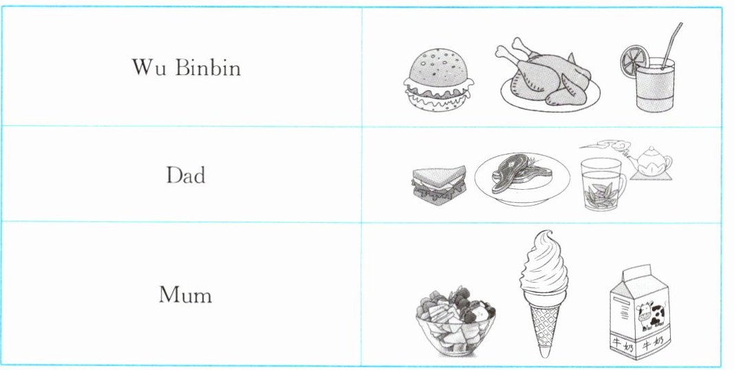 1. a hamburger, some chicken and some orange juice 2. a sandwich, some beef and some tea 3. some salad, an ice cream and some milk