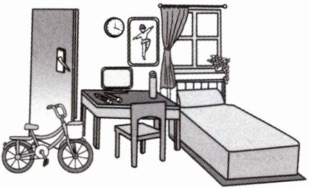 Hello! I’m Xiao Yu. I’m a pretty girl. This is my room. There is a white bed in it. There is a yellow desk and a yellow chair near the bed. A black computer is on the desk. There is a pink water bottle on the desk, too. On the wall, there is a red clock. And a photo of me is on the wall, too. On the floor, there is a pink bike. Do you like my room? Please draw it for me.