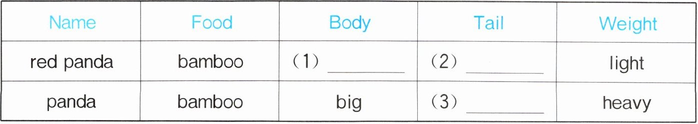 )(2)The ______ has a longtail(长尾巴). A. panda B. red panda2. ★梳理小熊猫和大熊猫的信息,完成表格。