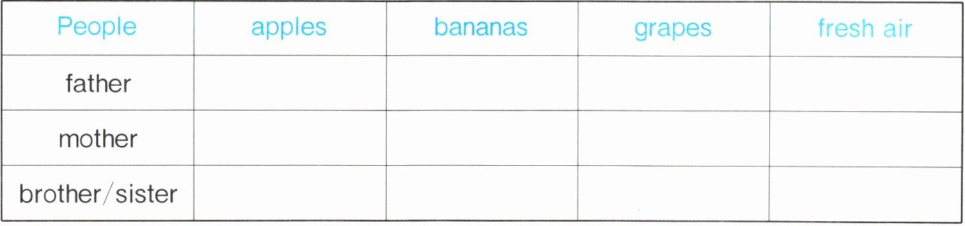 3. 示例(根据实际调查结果填写,此处以常见情况为例):假设father喜欢apples和fresh air,mother喜欢bananas和fresh air,brother/sister喜欢grapes和fresh air。