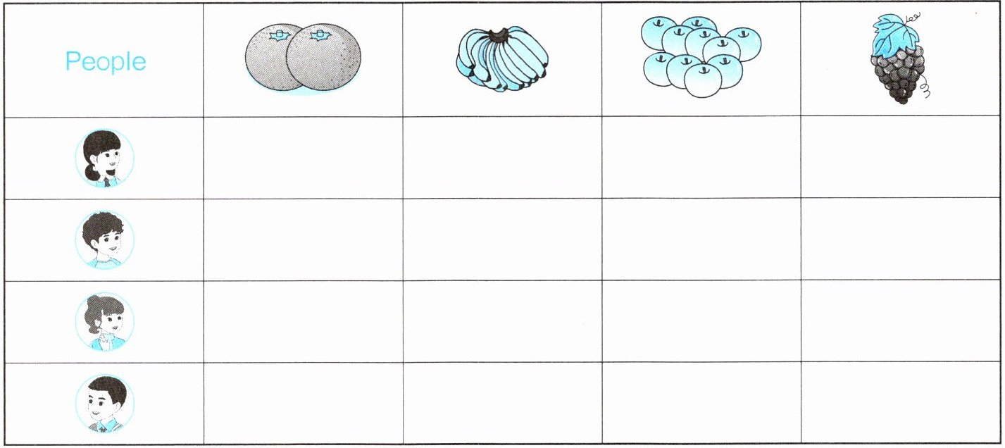 小朋友们学会了制作果汁,他们想做什么口味的呢? 听一听,在他们喜欢的水果下面画 吧!
