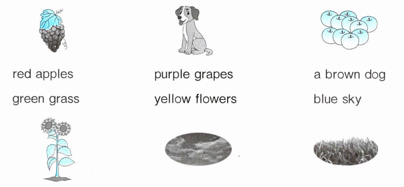 葡萄—purple grapes;小狗—a brown dog;苹果—red apples;向日葵—yellow flowers;天空—blue sky;草—green grass