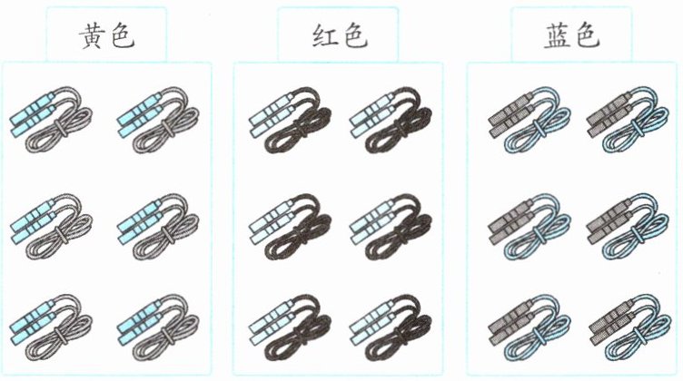 运动会各种颜色的跳绳数量要求如下。 请在货架上圈出相应数量的跳绳吧。
