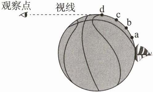 (2)将准备好的小船模型在球面上沿着一条线向观测者所在方向缓慢移动,并分别记录好小船模型在a、b、c、d四处时,观测者所看到的桅杆的长度(参照下图)。