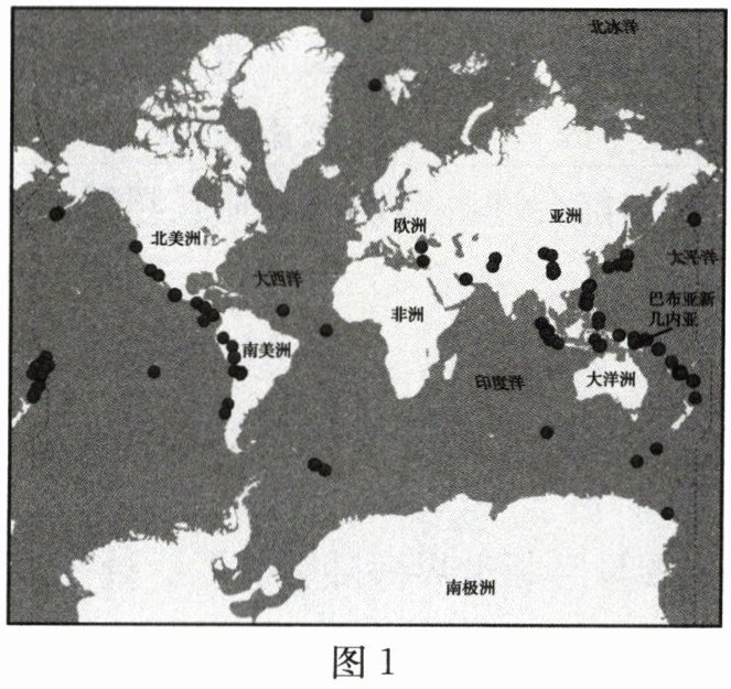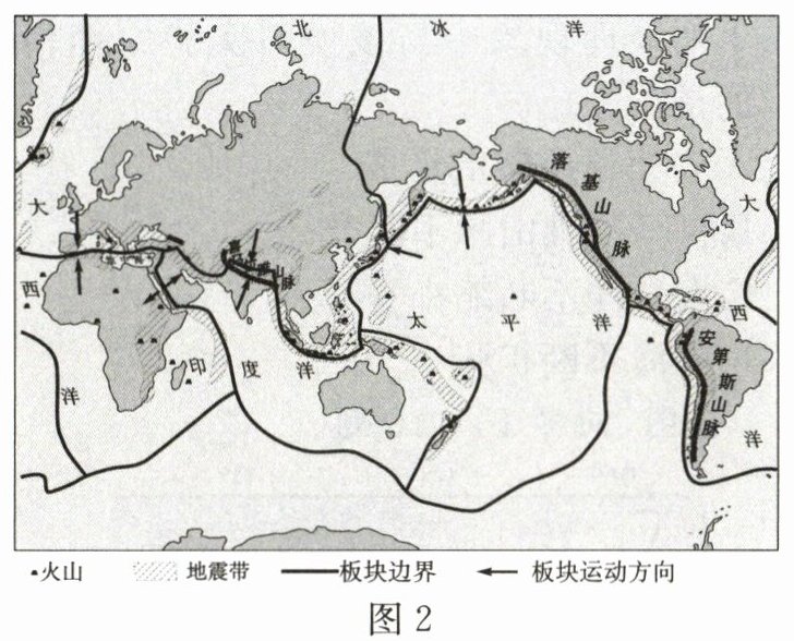 2022年,全球共发生里氏6.0级及以上地震112次,其中里氏6.0—6.9级105次,里氏7.0—7.9级7次,里氏8.0级及以上0次。最大地震是9月11日在巴布亚新几内亚发生的里氏7.6级地震。图1为2022年全球里氏6.0级及以上地震活动分布图,图2为六大板块分布示意图。读图,回答17~18题。