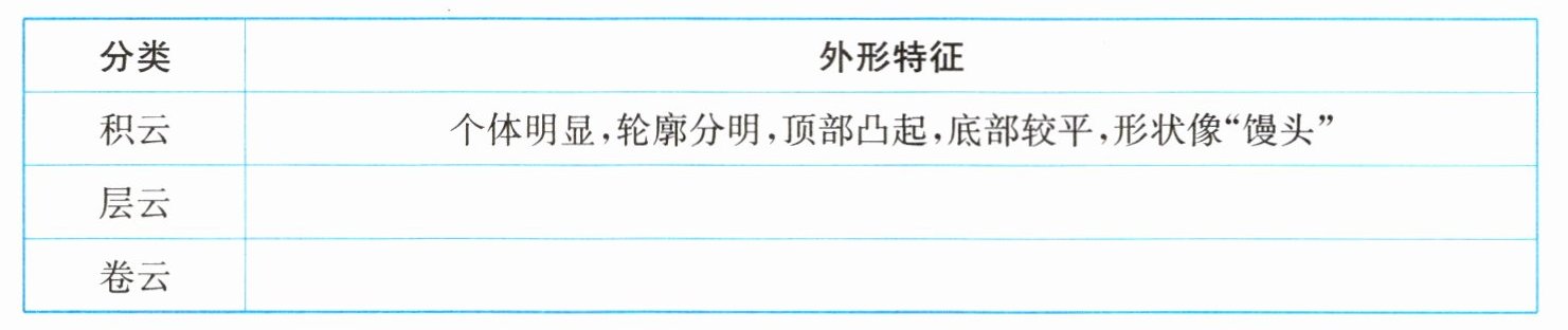 描述:参考示例,在下表中分别填写层云和卷云的外形特征。