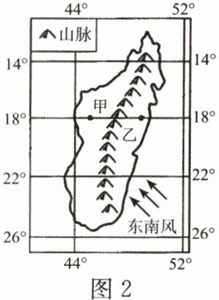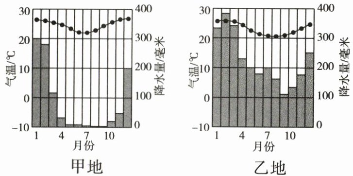 猴面包树是热带草原中一种非常奇特的乔木,树干粗大,喜温耐旱,干季时落叶以减少水分蒸腾,湿季时可大量储水于树干中。读猴面包树景观图(图1),甲、乙两地位置图(图2)及甲、乙两地气候资料图,回答16~18题。