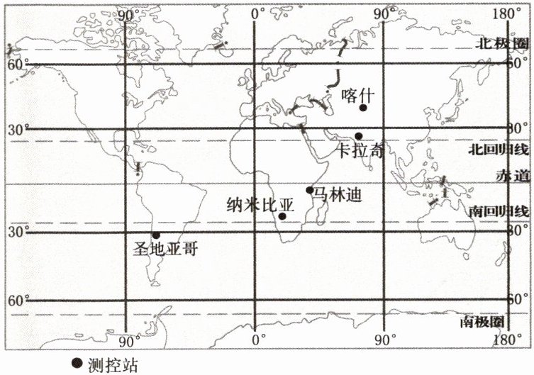 北京时间2024年4月30日17时46分,“神舟十七号”载人飞船返回舱在东风着陆场成功着陆。读我国部分陆上航天测控站世界分布图,回答8~9题。