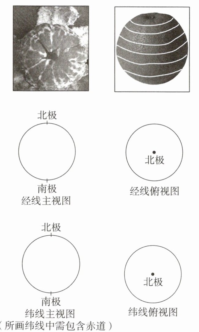 (4)沿纬线切开橘子,绘制纬线的主视(从侧面观察)图、俯视(从北极上空观察)图。(使用小刀时要注意安全)