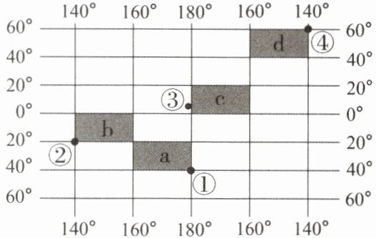 14. 救援队员小峰发现经纬网图中标注的四处阴影区域面积一样大,实地面积最小的是(