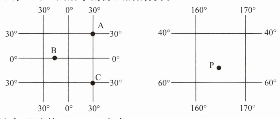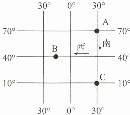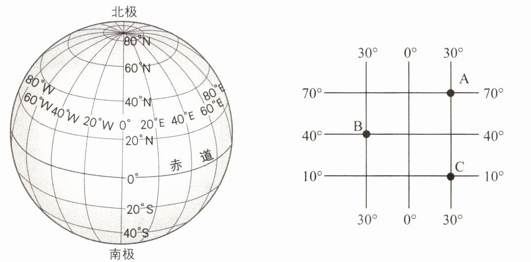 1. 东经 西经 北纬 南纬 2. 经线 纬线 经度 纬度 3. 70°N,30°E 40°N,30°W 10°N,30°E 4. A、C A、B、C 5. B