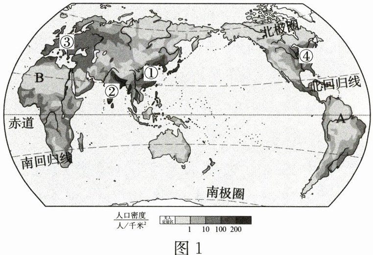 ,④为北美东部。(4分)(2)从海陆位置来看,世界人口稠密区主要分布在