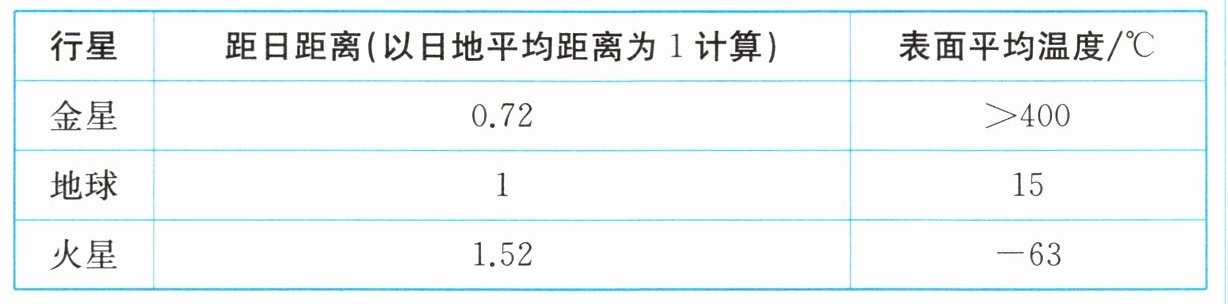 (1)距日距离越近,行星表面的平均温度越高;距离越远,平均温度越低(合理即可)