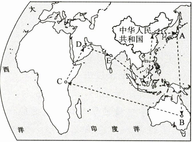 22. 某中学地理老师为学生设计了一个“环游世界”的网络模拟旅游主题学习任务,图中箭头表示网络模拟旅游线路。读图,回答下列问题。(8分)