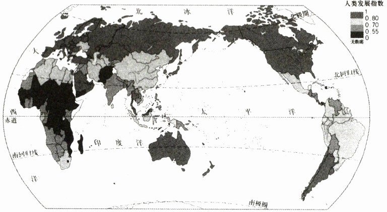 (1)据图分别说出人类发展指数较高地区与较低地区的分布特点。(从半球位置和大洲位置两方面作答)(6分)