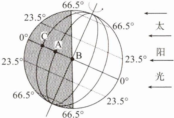 6. 读地球上的昼与夜示意图,图中A、B、C三点(