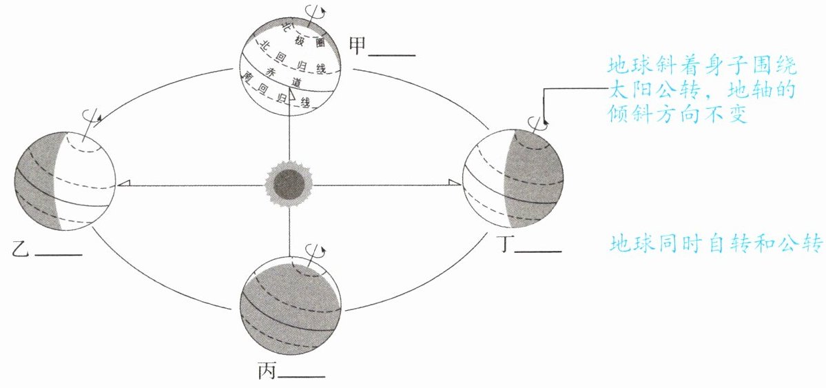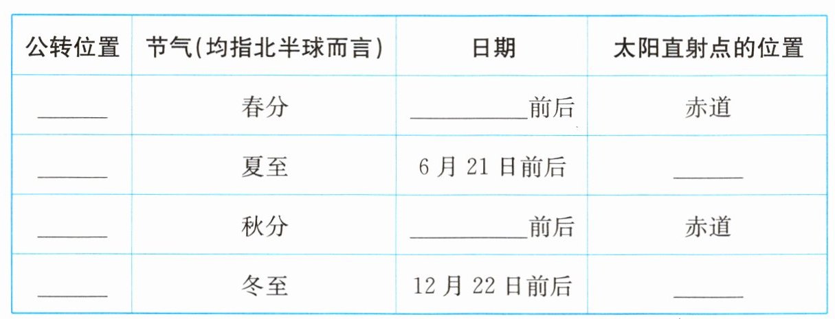 2. 在上图中公转轨道上用箭头标出地球的公转方向。
