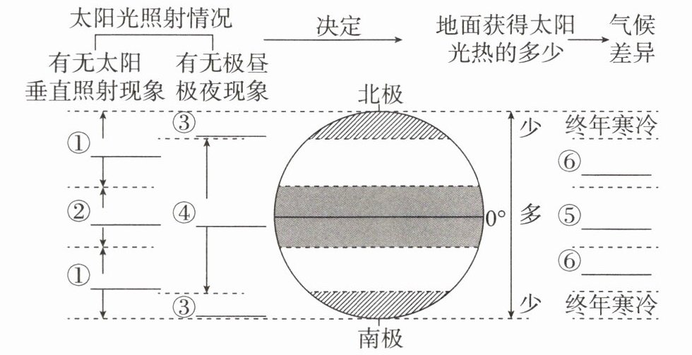 1. 太阳光热;北寒带;北温带;热带;南温带;南寒带;