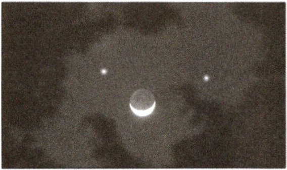 “双星伴月”是一种有趣的天象。下图为某次“双星伴月”天象发生时拍摄的照片,弯弯的蛾眉月与金星和木星近在咫尺,交相辉映,十分引人注目。读图,回答 1~2 题。