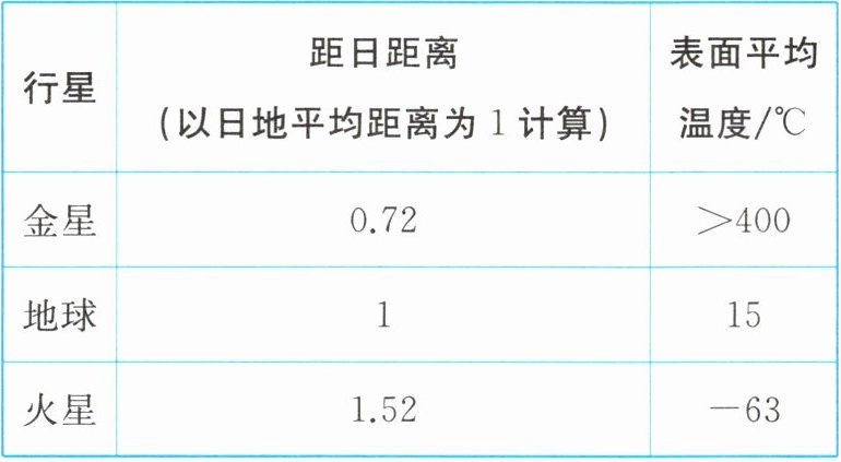 5. 液态水的存在是地球生命起源和发展的重要条件之一。读表,比较地球与金星、火星的表面平均温度,判断下列叙述中与地球“液态水存在”有密切关系的是(