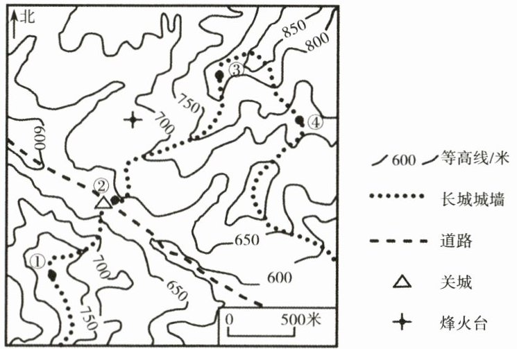 凯凯同学打算暑假去攀登长城,攀登前对长城所在区域等高线地形图进行了研究。读图,回答 13~14 题。
