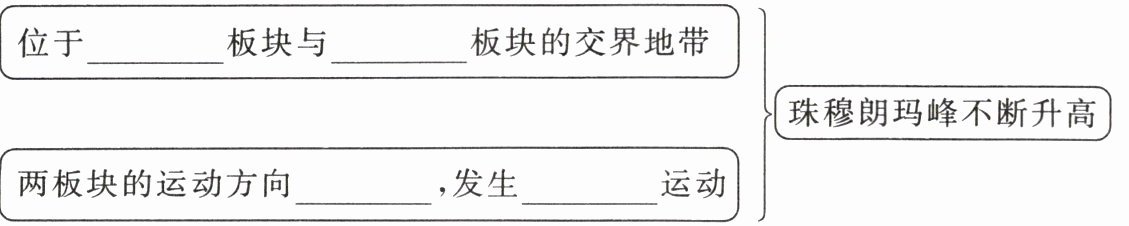 印度洋板块与亚欧板块相对运动,发生碰撞挤压,导致珠穆朗玛峰不断升高。