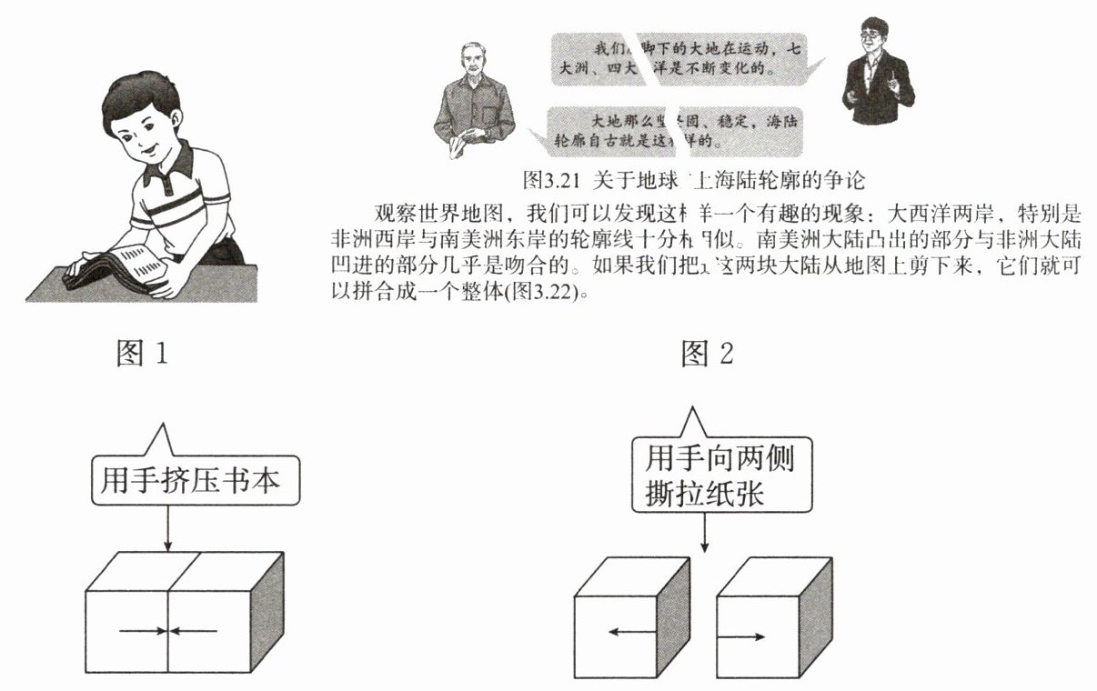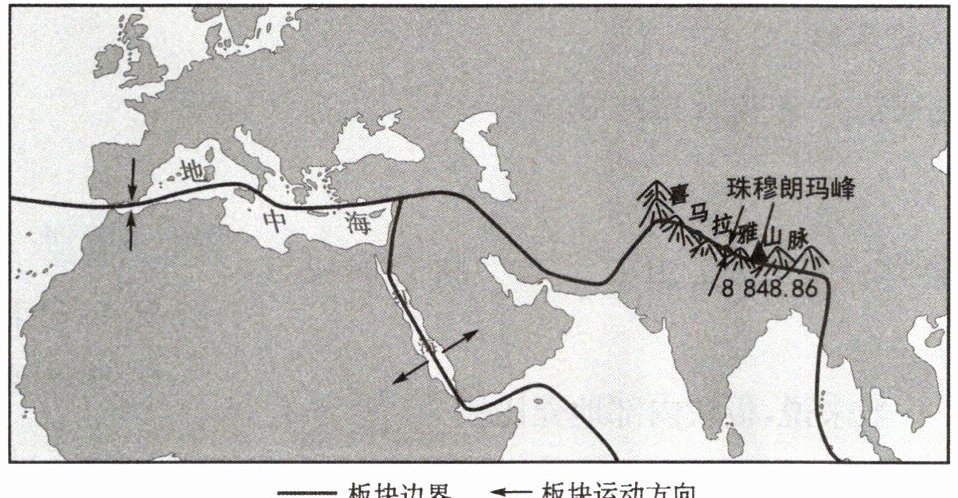 读教科书图 3.29,解释珠穆朗玛峰不断升高的原因、地中海不断缩小的原因和红海不断扩张的原因。