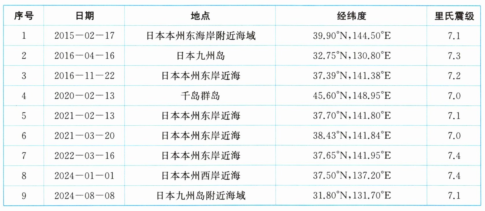 进入 21 世纪以来日本及其附近地区发生过的里氏 7.0 级及以上的大地震(部分)
