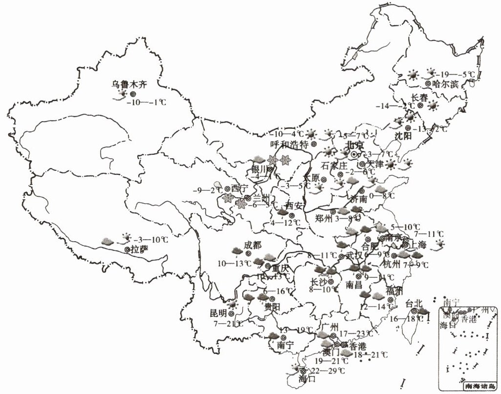填图·绘图 哈尔滨 北京:晴转多云,最低气温$-5^{\circ}C$,最高气温$7^{\circ}C$ 拉萨:阴转多云,最低气温$-3^{\circ}C$,最高气温$10^{\circ}C$ 沈阳:多云转晴,最低气温$-13^{\circ}C$,最高气温$2^{\circ}C$