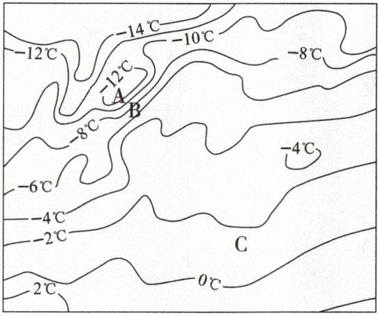 填图·绘图 ①略。 ②-12 ℃等温线(闭合)内侧的区域。 从左到右,从上到下:海拔 气温 盆地(或洼地) 低温 陡 大 缓 小