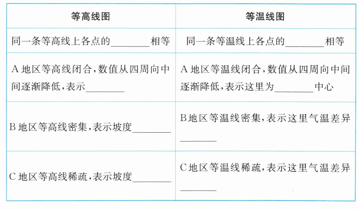 假如上面的等温线图是一幅等高线图,我们把等温线图和等高线图相对比,来掌握等温线图的特征。