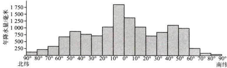 5. 下图为全球年降水量随纬度的变化示意图。读图,关于全球年降水量分布特点的描述,正确的是(