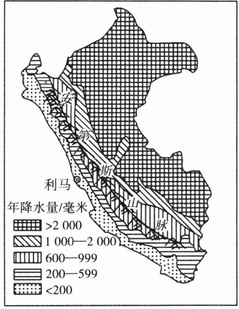 6. 读秘鲁年降水量分布图,关于该国年降水量分布特点的说法,正确的是(