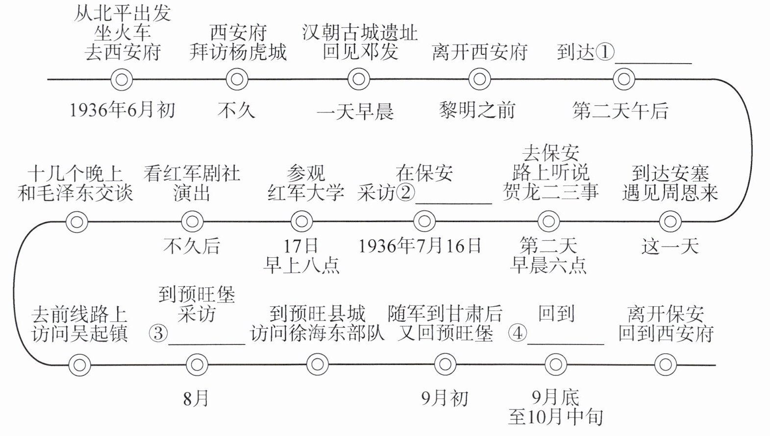 3. 下面是某同学整理的1936年6月至10月作者采访“红色中国”的主要行程,请你帮他补全横线处的内容。