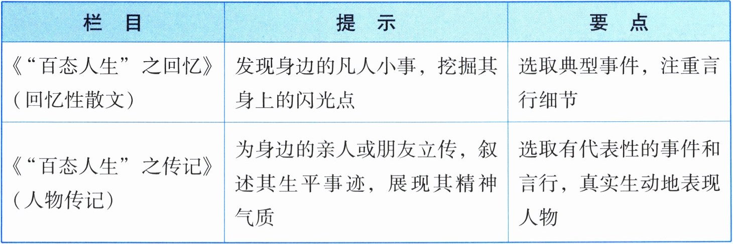 |《“百态人生”之传记》(人物传记)|为身边的亲人或朋友立传,叙述其生平事迹,展现其精神气质|选取有代表性的事件和言行,真实生动地表现人物|