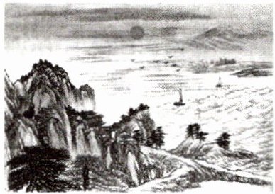 13. 请你仔细观察下面这幅图,发挥想象,用简明的语言描绘出“海日生残夜,江春入旧年”这两句诗所表现的图景。(50字左右)