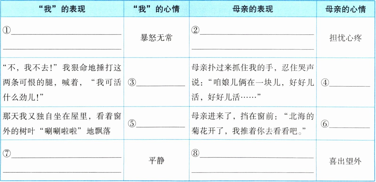 ①望着望着天上北归的雁阵,我会突然把面前的玻璃砸碎;听着听着李谷一甜美的歌声,我会猛地把手边的东西摔向四周的墙壁 ②母亲就悄悄地躲出去,在我看不见的地方偷偷地听着我的动静。当一切恢复沉寂,她又悄悄地进来,眼边儿红红的,看着我 ③自暴自弃 ④心疼痛苦 ⑤伤感落寞 ⑥担忧 ⑦“什么时候?”“好吧,就明天。” ⑧她高兴得一会儿坐下,一会儿站起……她也笑了,坐在我身边……