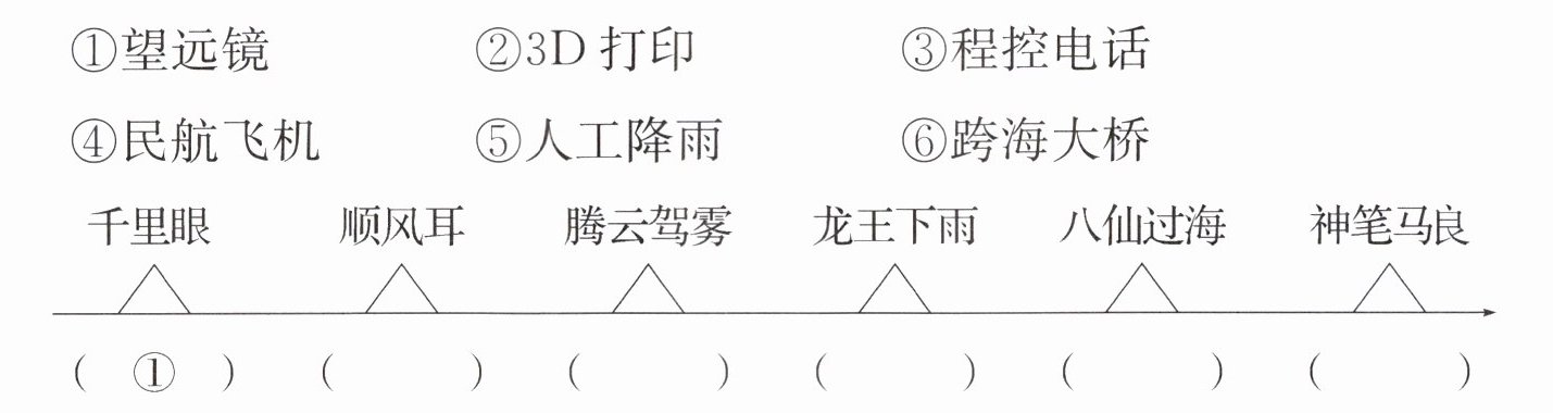 $\begin{array}{cccccc}千里眼 & 顺风耳 & 腾云驾雾 & 龙王下雨 & 八仙过海 & 神笔马良 \\ \triangle & \triangle & \triangle & \triangle & \triangle & \triangle \\ (①) & ( ) & ( ) & ( ) & ( ) & ( ) \\\end{array}\\ $