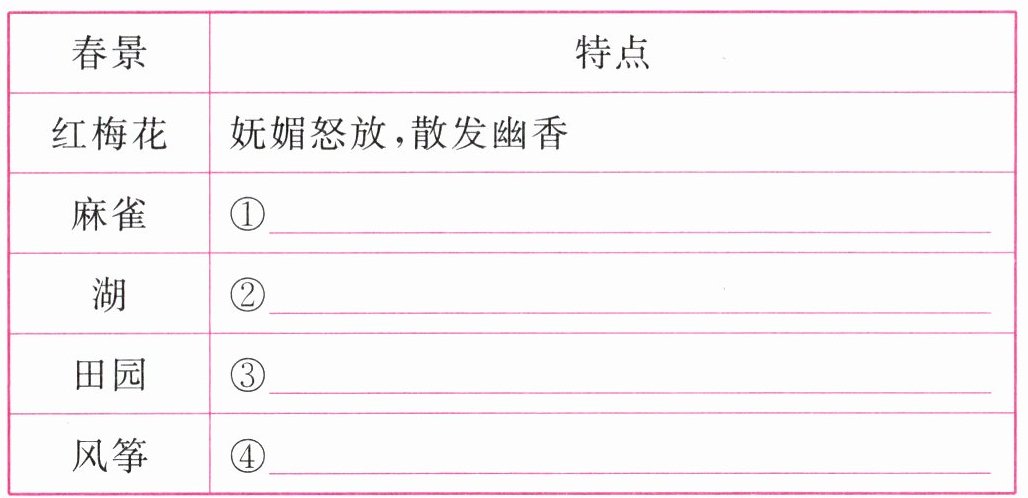 12. 在作者的笔下,春天的不同景物具有不同的特点。请根据文章内容,将下面的表格补充完整。(8分)