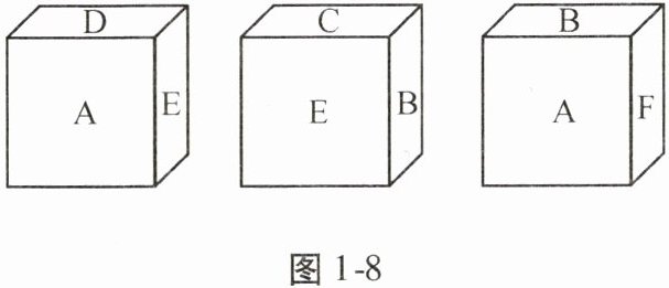 11. 一个小立方块的六个面分别标有字母A,B,C,D,E,F,从三个不同方向看到的情形如图1-8所示,则A对面的字母应是