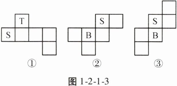 【例 2】如图 1 - 2 - 1 - 3,如果约定用字母 S 表示正方体的侧面,用 T 表示上面,用 B 表示底面,请把相应的字母填在以下展开图中。