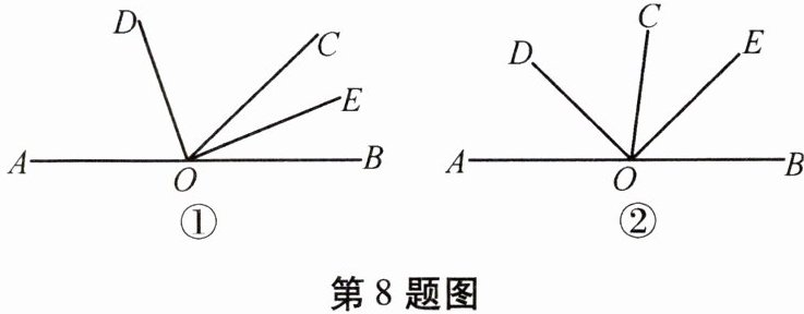 8. 已知 $ O $ 为直线 $ AB $ 上一点,$ \angle DOE = 90° $。