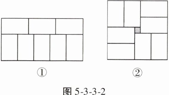 【例 3】小文在拼图时,发现 $8$ 个一样大小的长方形,恰好可以拼成一个大的长方形如图 5-3-3-2①。小成看见了,说:“我也来试一试。”结果小成七拼八凑,拼成了如图②所示的正方形,中间还留下了一个面积为 $4$ mm^2的小正方形缺口,求每个小长方形的周长。