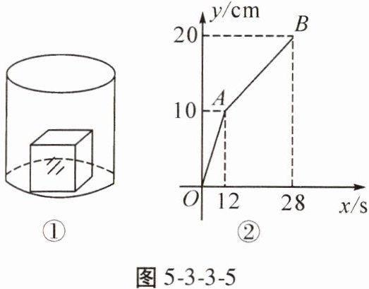 8. 如图 5-3-3-5①,一个正方体铁块放置在圆柱形水槽内,现以一定的速度往水槽中注水,$28$ s 时注满水槽,水槽内水面的高度 $y$(cm)与注水时间 $x$(s)之间的函数图象如图②所示。如果将正方体铁块取出,又经过多少秒恰好将水槽注满,此水槽的底面面积为多少平方厘米?