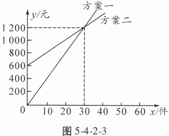(2)由图象可得点(0,600),(30,1200),设方案二的函数表达式为y=kx+b,把(0,600),(30,1200)代入上式,得{b=600,30k+b=1200,解得{k=20,b=600。所以方案二的函数表达式为y=20x+600。