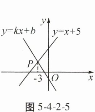 4. 如图 5-4-2-5,一次函数 $ y = kx + b $ 与 $ y = x + 5 $ 的图象相交于点 $ P(-3,m) $,则方程组 $ \begin{cases} y = kx + b, \\ y - x + 5 = 0 \end{cases} $ 的解是______。